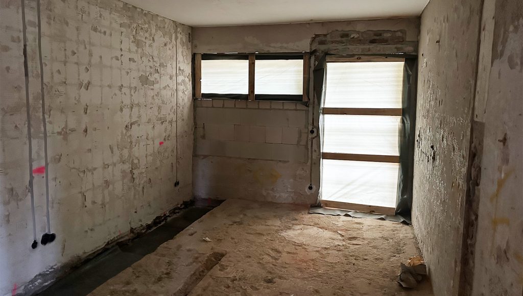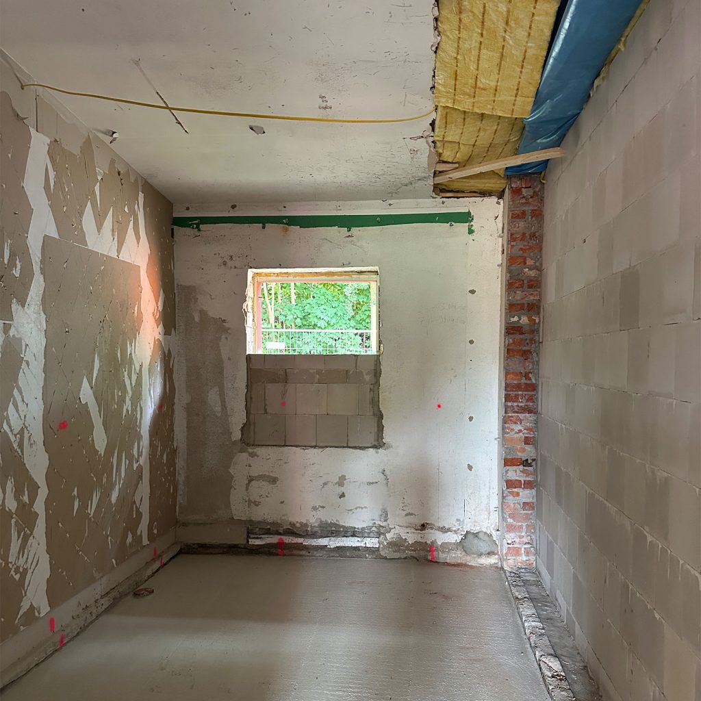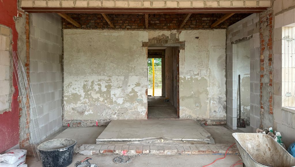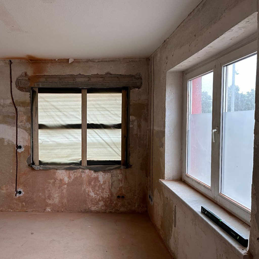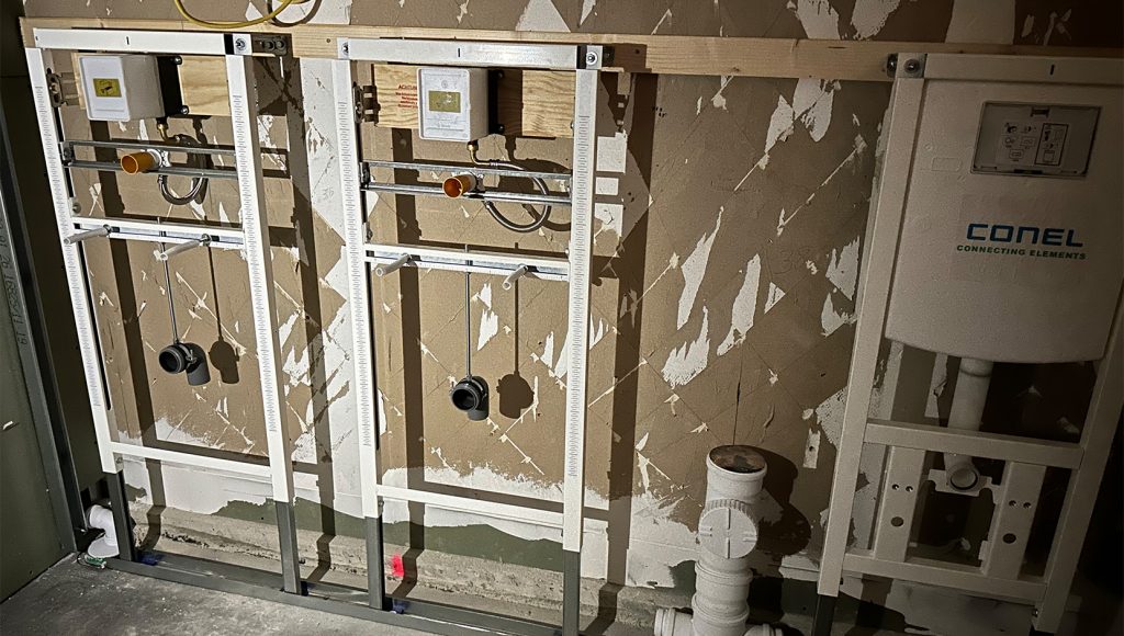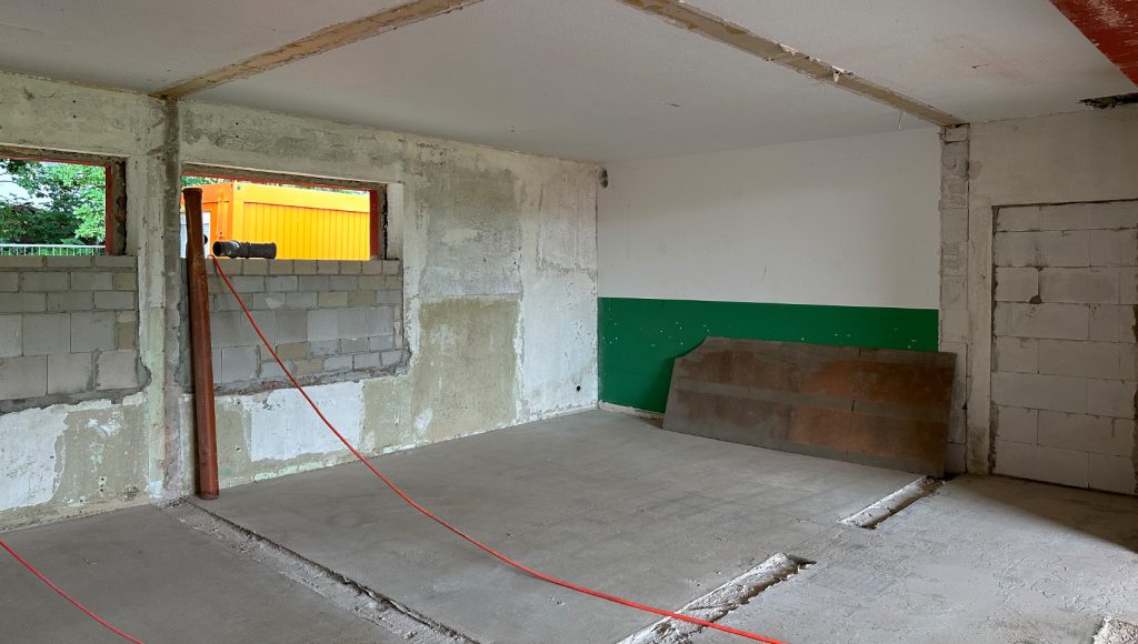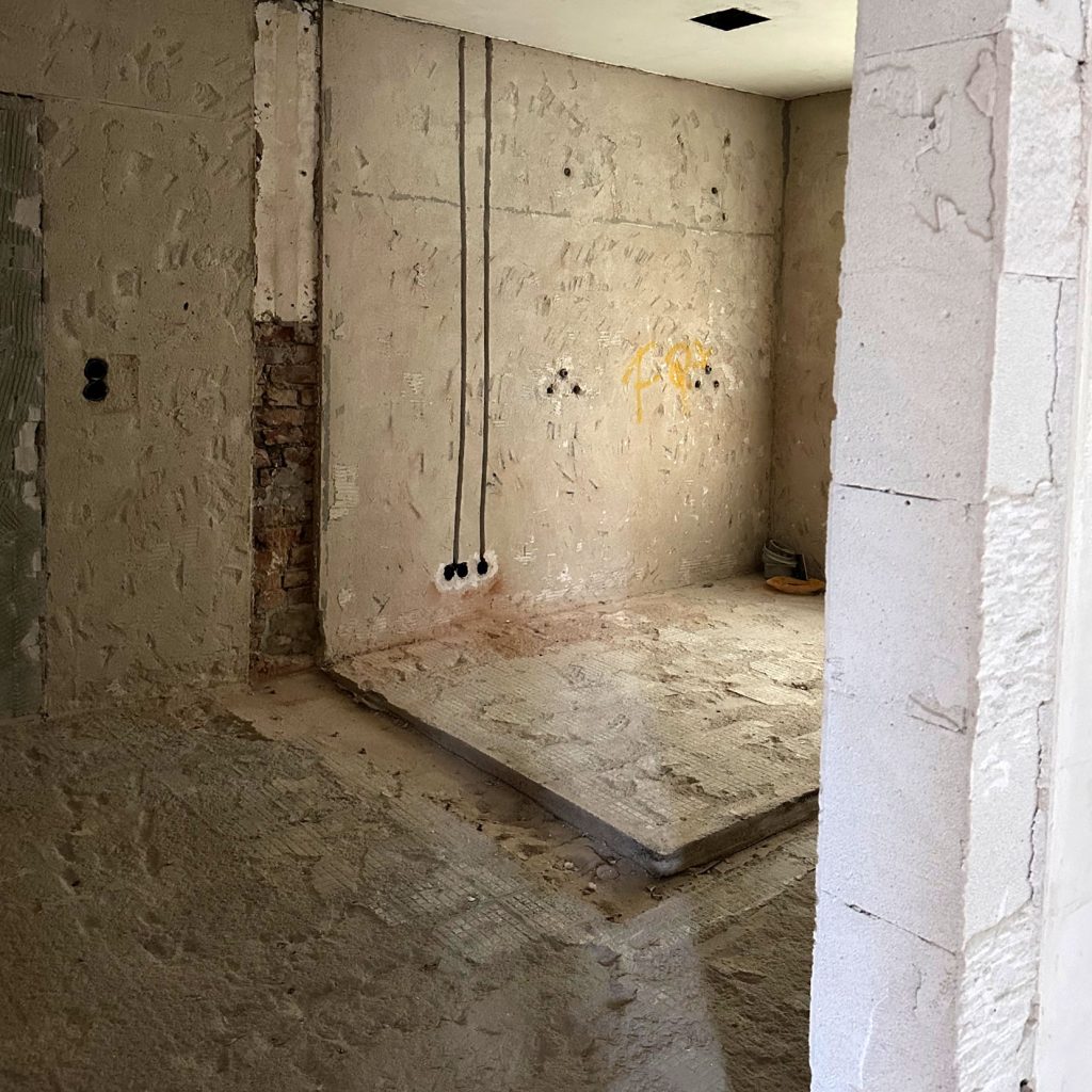 … der Elektriker hat die Unterputzdosen gesetzt und die Kabelwege geschlitzt, erste Kabel sind bereits gezogen; die Klempner haben die Vorwandmodule gestellt und beginnen mit dem Verlegen der Wasser, Abwasser- und Heizungsleitungen